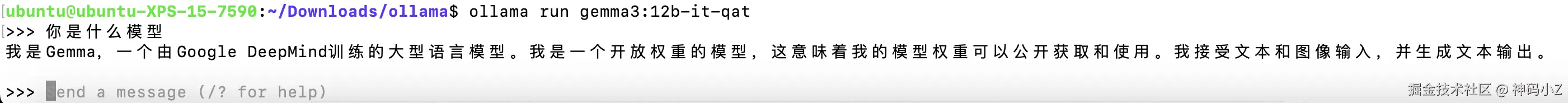 直接输入消息可以进行测试,12b已经测试过,我这配置有点慢,建议安装4b参数版,使用ctrl+D可以退出运行