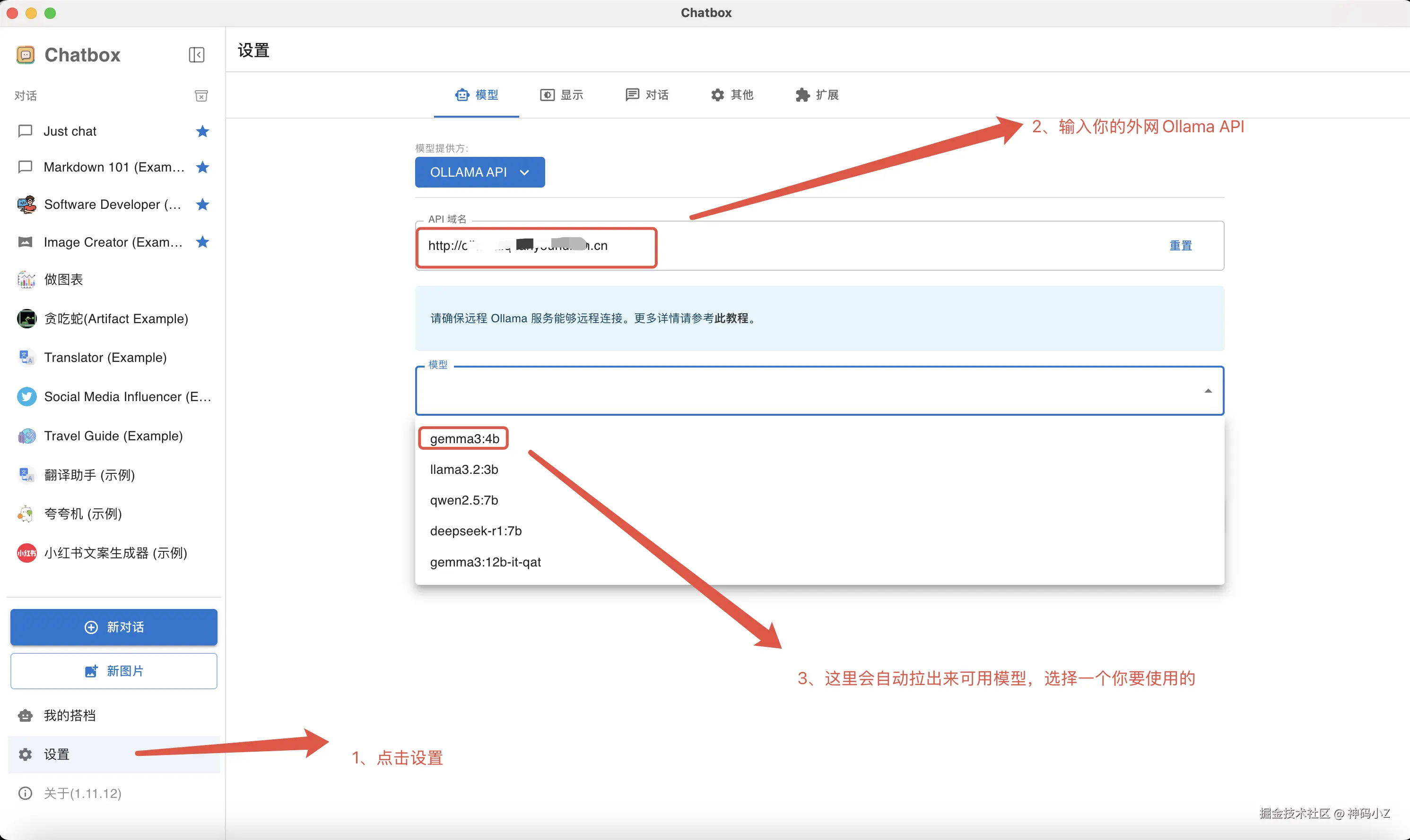 像上面那样使用命令端响应得到的结果不美观,这么我们可以使用一些支持API的客户端,推荐使用Chatbox(官网地址:chatboxai.app/zh),它支持直接配置Ollama API地址