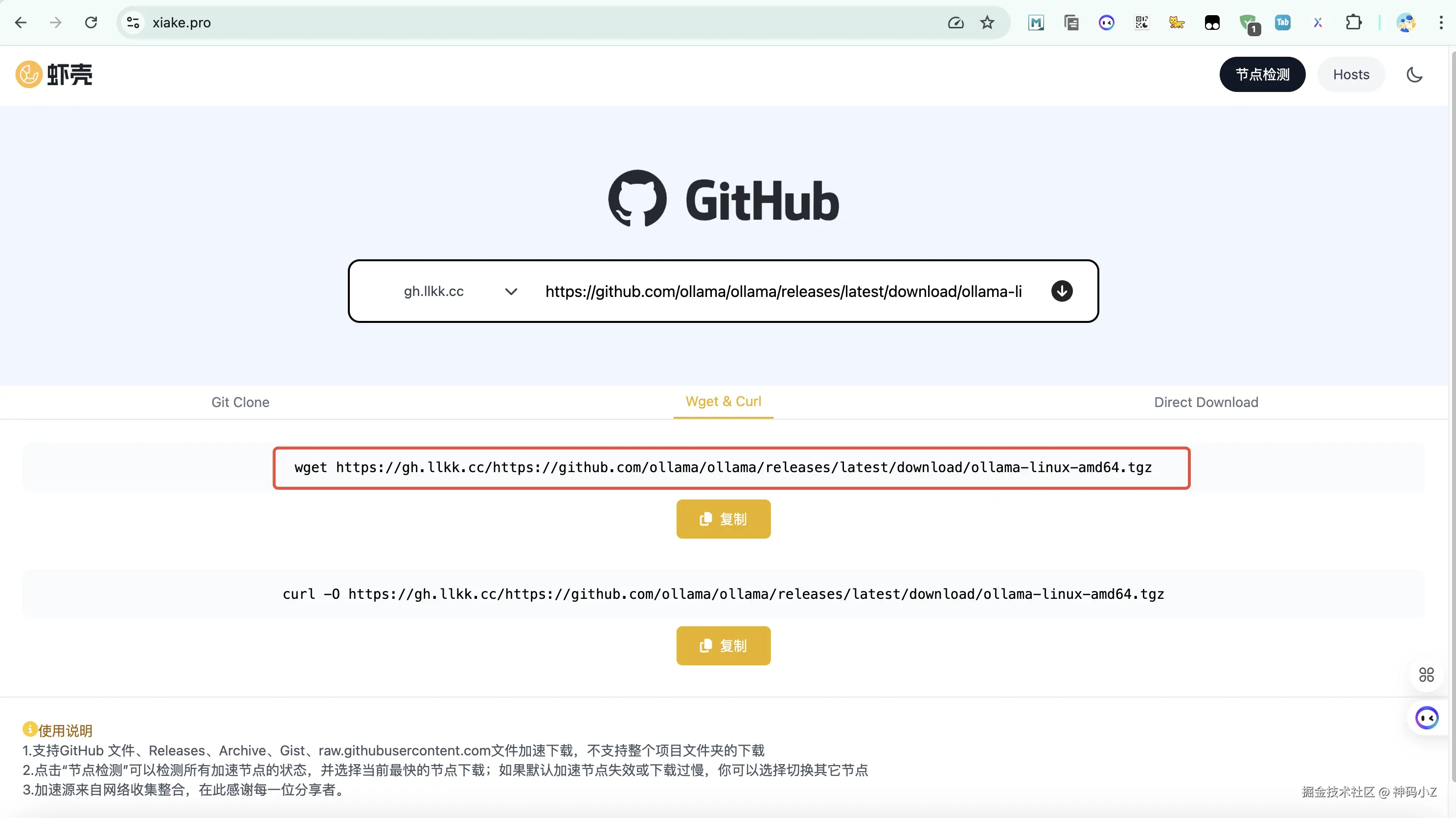 因为github.com正常是无法访问了,这里我使用了虾壳加速(xiake.pro/),把正常github地址拷贝进去就可以得到加速后地址