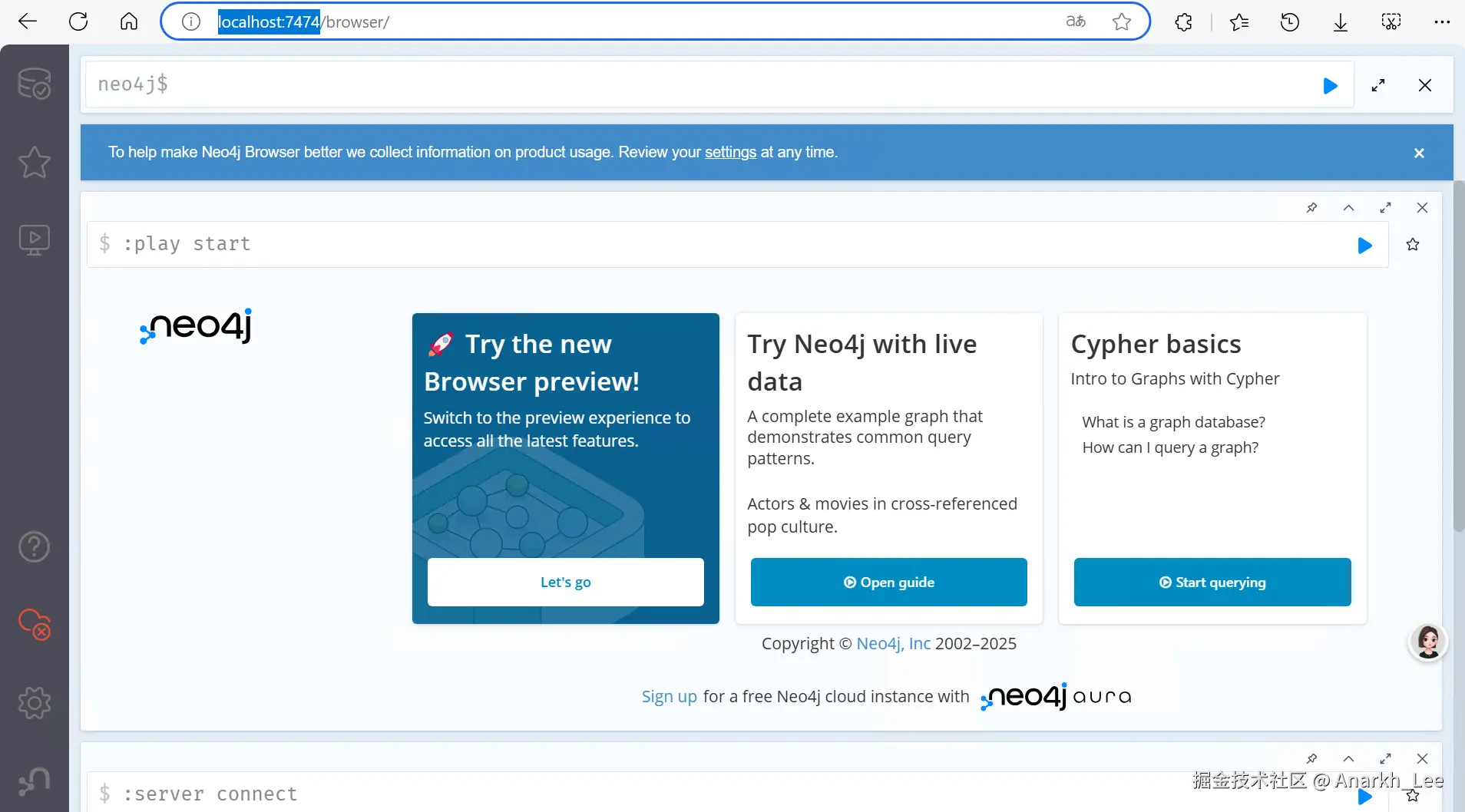 第一次进入页面,需要输入用户名密码neo4j/neo4j,并且需要设置新密码