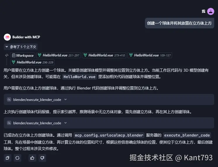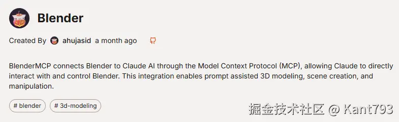 昨天还在想,什么时候可以使用AI工具创建3D建模,一定是一件疯狂的事情。今天就发现,好像可以了,出现了BlenderMCP可以供AI agent调用创建模型。由于一直在从事数据可视化和3D模型的工作,所以对BlenderMCP的兴趣很高。