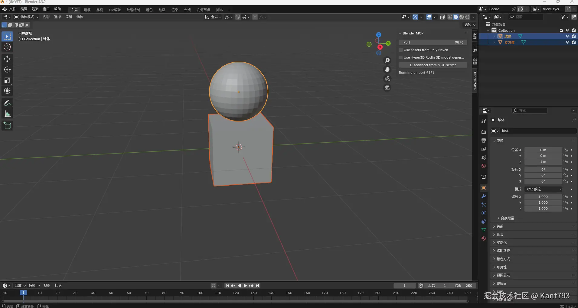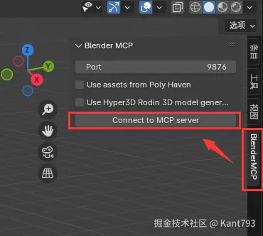 输入快捷键N,选择BlenderMCP,点击Connect