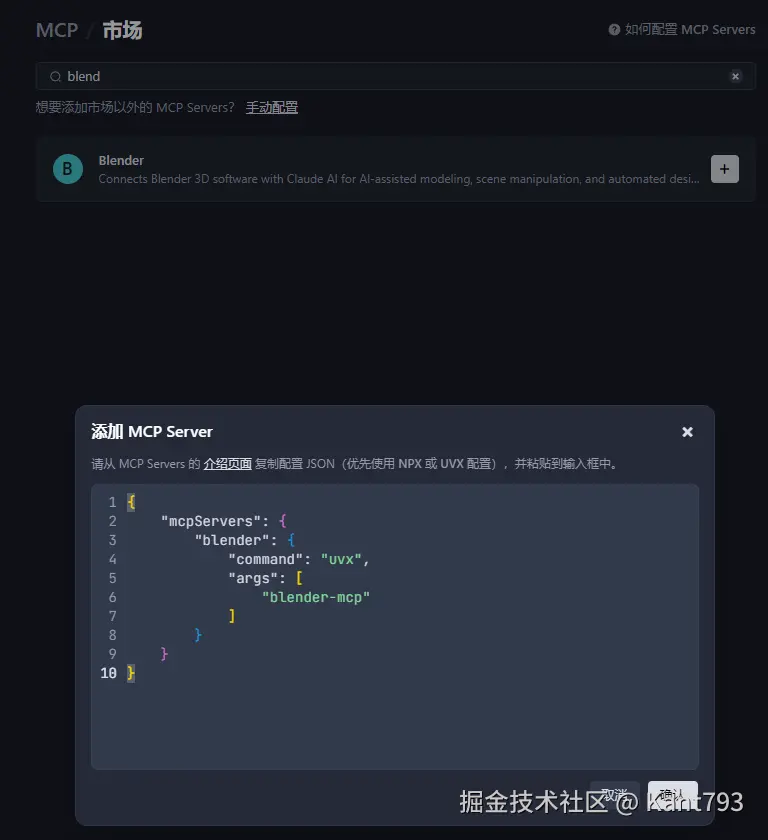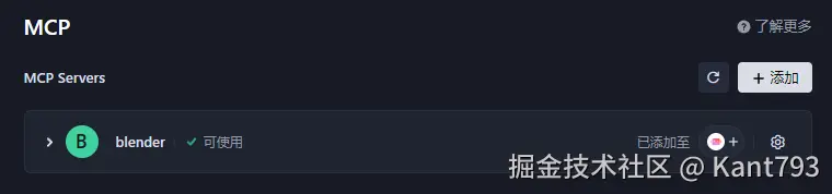 在MCP市场中,找到blender并添加
