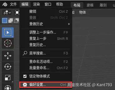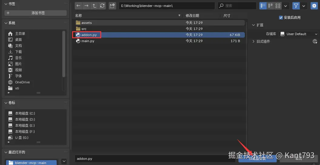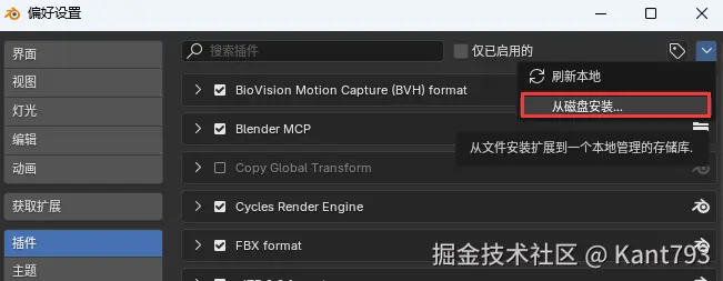 点击偏好设置,选择从磁盘安装,选中clone下来项目中的addon.py
