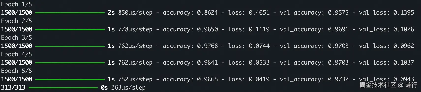MNIST 训练集共有 60000 张图片,20% 的数据划分为验证集,训练集实际使用 48000 张图片,每批 32 张图片,每个 epoch 需要 1500 步才能处理完所有训练数据