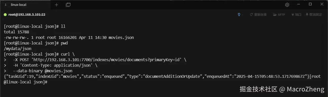 - 下载完成后我们上传到服务器的指定位置,然后通过curl工具将数据导入到Meilisearch中;