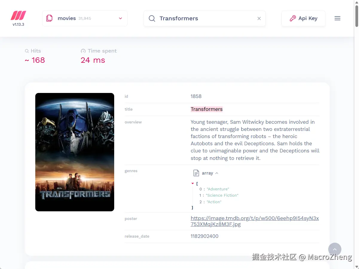 下面是使用Meilisearch实现即时搜索的效果图,搜索速度还是非常快的!