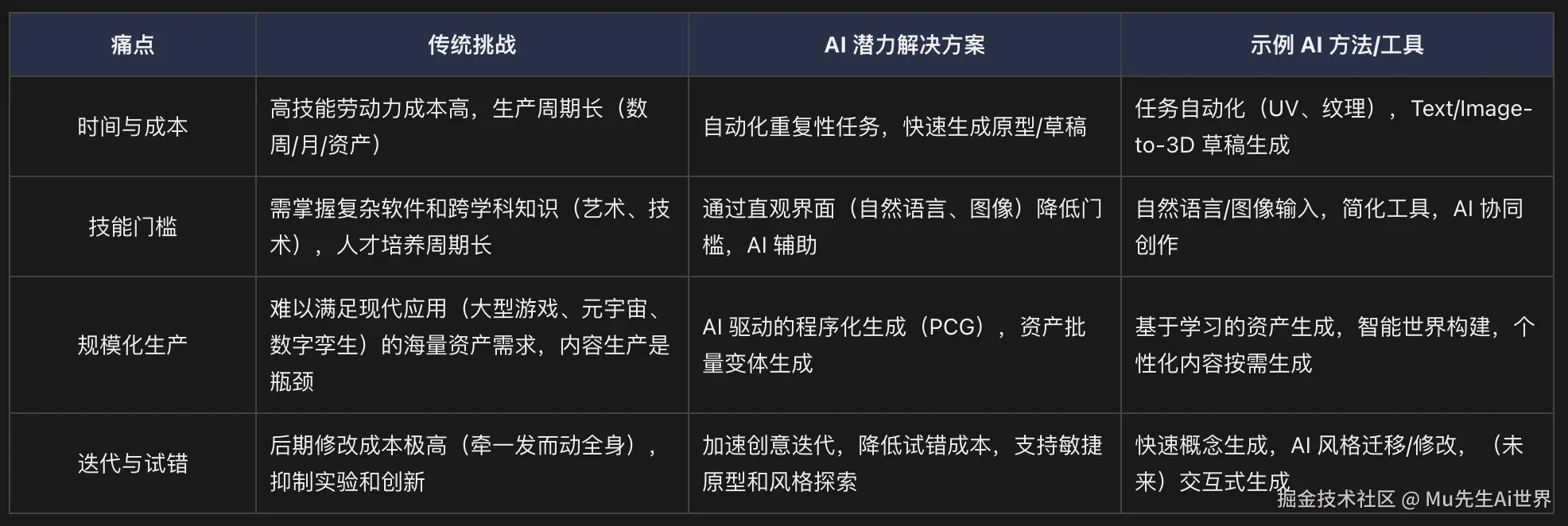 ② 传统瓶颈:完全手工制作成本高昂(数亿美元)、周期漫长(2-5 年),难以满足玩家对内容量和更新速度的期待,内容创作常是瓶颈。