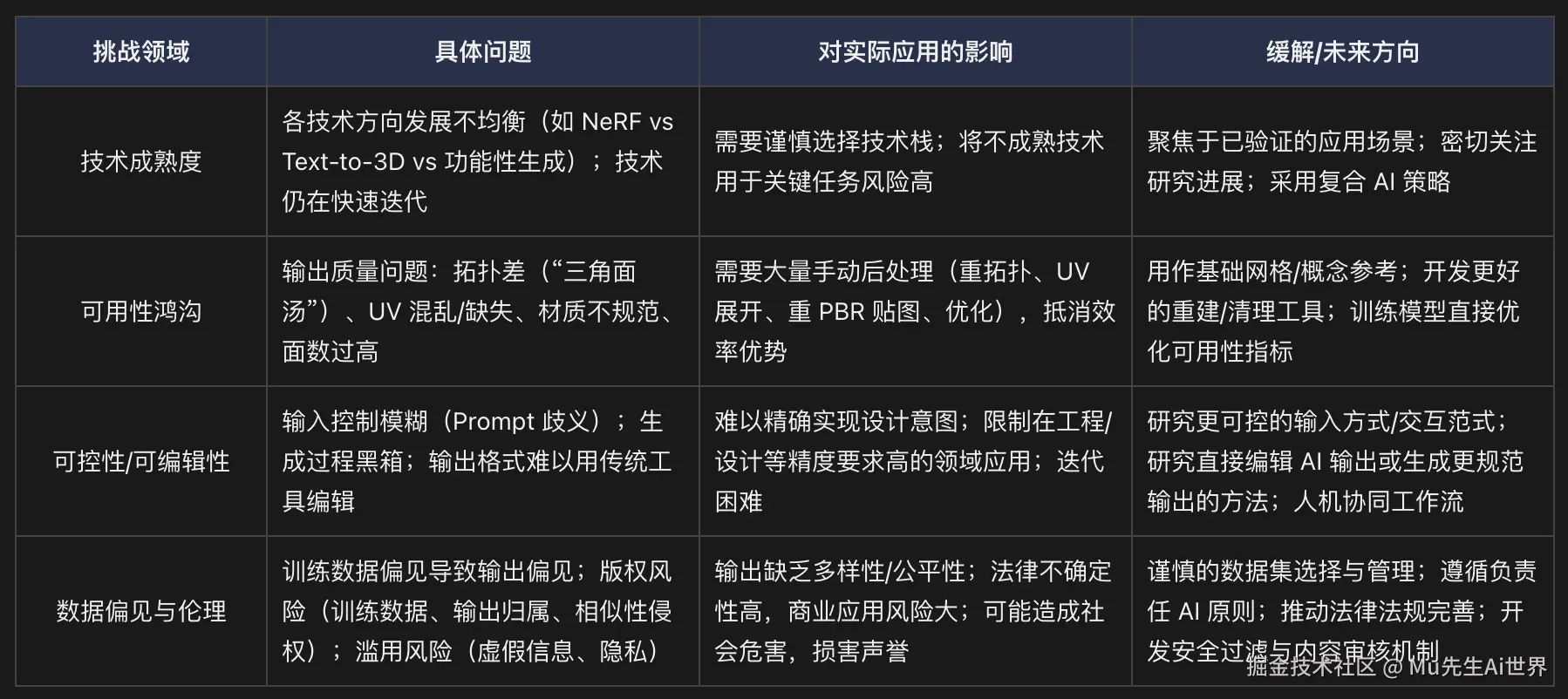 表 2: 当前 AI 3D 生成挑战与影响