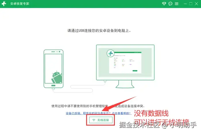 操作步骤1: 打开软件,使用USB数据线或者点击【无线连接】,连接你的Android手机和电脑。