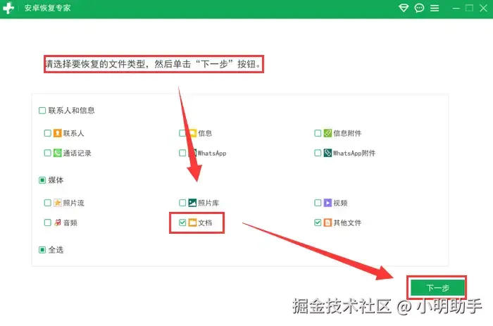 操作步骤2: 在软件新的页面中,跟随指引选择需要的文件类型,如【文档】、【照片流】等,并点击【下一步】进行自动扫描。