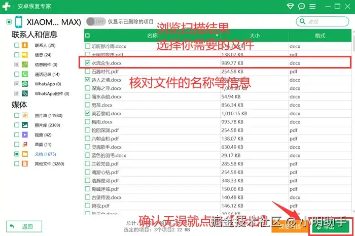 操作步骤3: 扫描完成后,数据 蛙会列出所有找到的文件。这时候,尽情浏览、挑选吧,看到需要的就直接勾选。要是选择好了,就点击右下角的【导出】,设置恢复路径,开始保存文件。