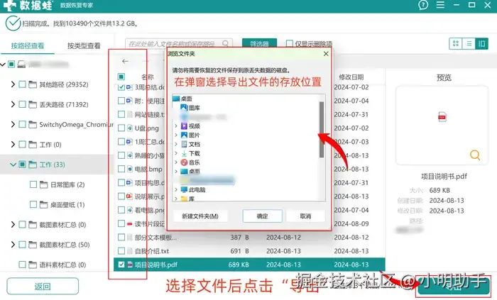 第2步: 勾选出自己需要恢复的文件再点击“导出”,在弹窗中选择文件的存放位置。