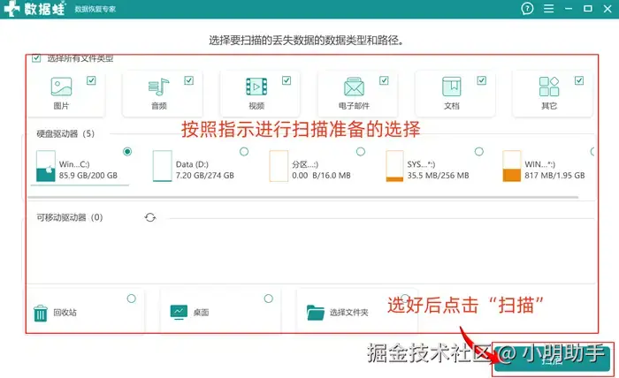 第1步: 在软件的首页上,选择隐藏起来的文件类型和需要扫描的位置,选好后点击“扫描”;