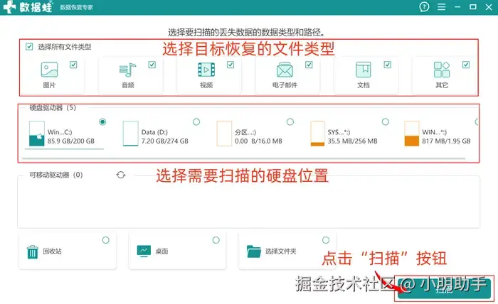第1步:在电脑中打开软件,在软件首页上选择目标文件的类型和硬盘位置,选好后点击“扫描”;