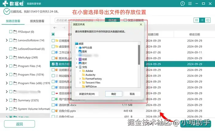 第2步:扫描文件结束后,在指定位置上勾选目标文件,点击“导出”;