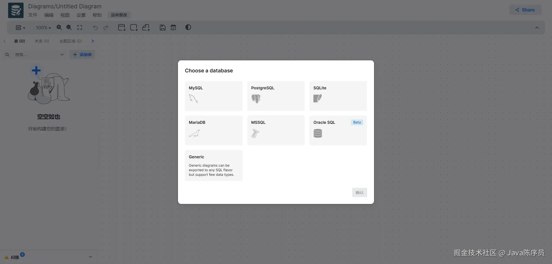 1、在开始使用 drawDB 时,需要先选择数据库类型,目前支持多种数据库