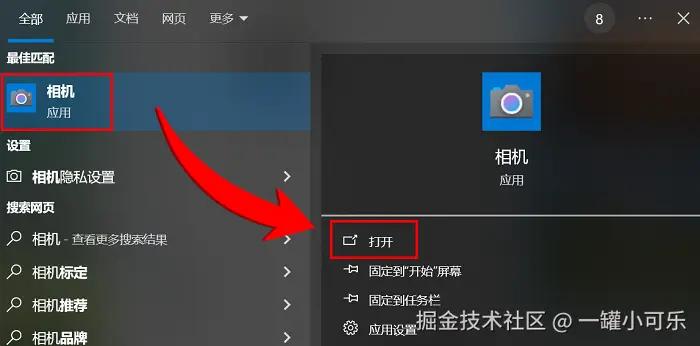 步骤1:按下键盘上的 “Win+S” 组合键,打开系统的搜索栏。在搜索栏中输入 “相机” ,并点击搜索结果中的 “相机” 应用。