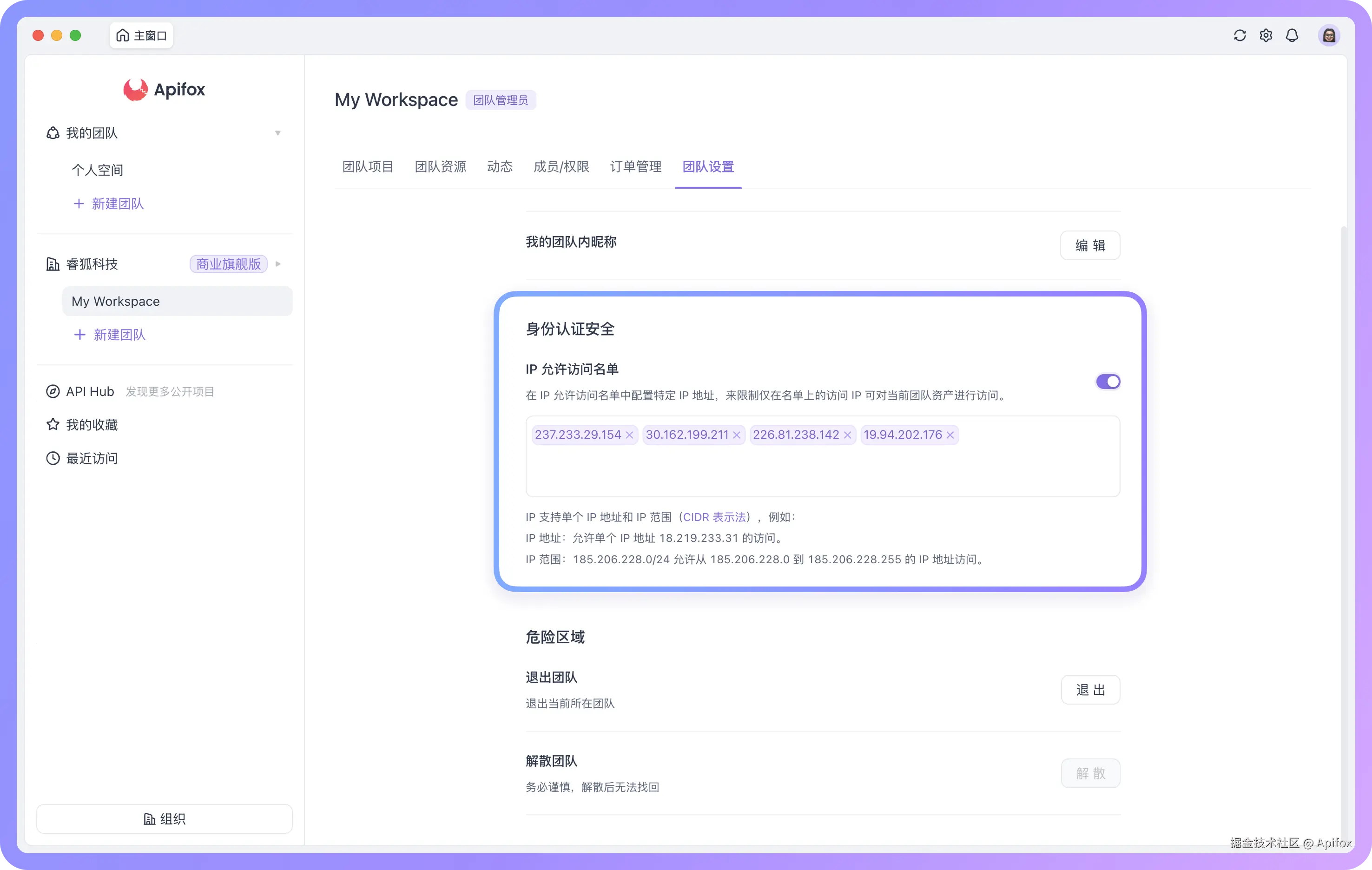 Apifox 新增「IP 允许访问名单」功能,支持为团队配置单个 IP 地址或 IP 范围 *(CIDR 表示法) *,限制只有在该名单上的 IP 才能访问团队资源。适合管理企业内网或特定办公网络的访问权限,为团队资产提供更精细的安全保护。