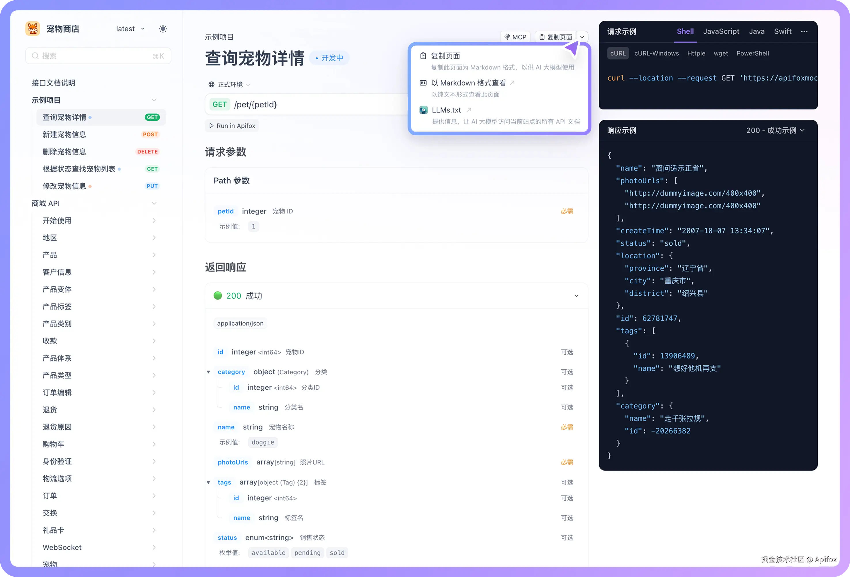 使用 Apifox 发布/分享的 API 文档,每个页面均提供.md格式的内容支持。用户可以点击「复制页面」按钮获取当前页面的 Markdown 内容,或者在页面 URL 后添加.md后缀,快速查看该页面的 Markdown 版本,将内容提供给 AI 作为上下文。