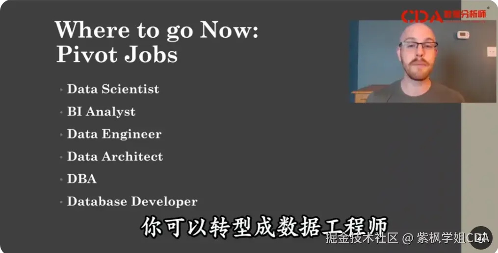 职业转型:基于数据分析师与其他岗位在工具和技能上的重叠性,可转型为数据科学家、商业智能分析师、数据工程师、数据架构师、DBA(数据库管理员)、数据库开发员等。后续会详细介绍转型方法。