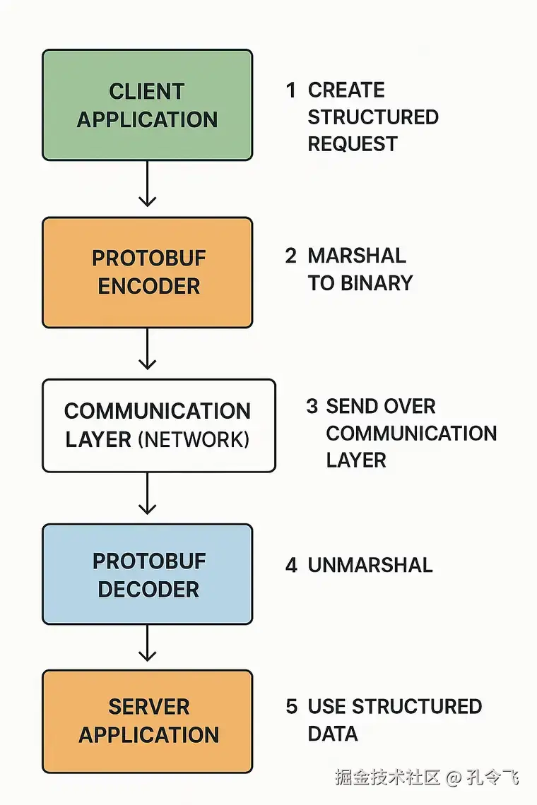 .proto描述文件; protoc编译生成各语言代码;- 在代码里直接调用序列化 / 反序列化方法;