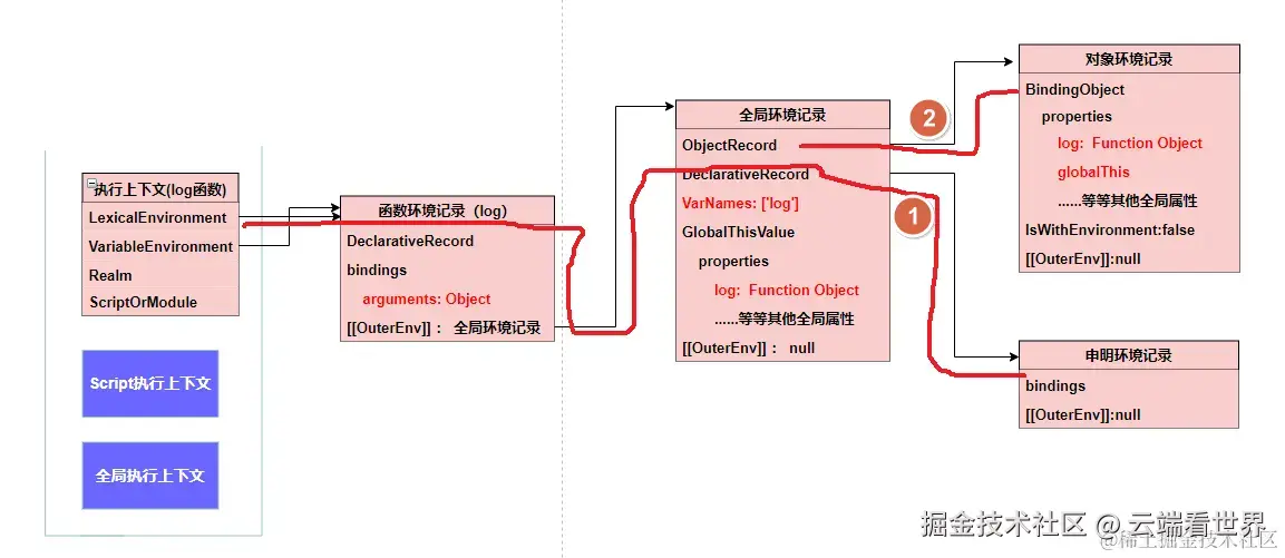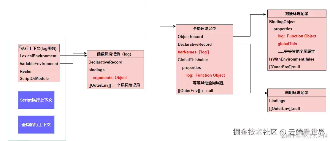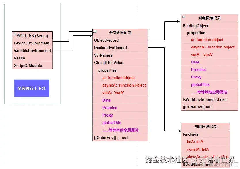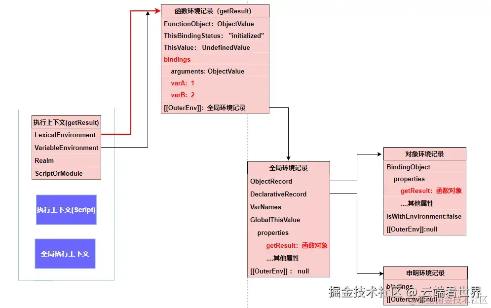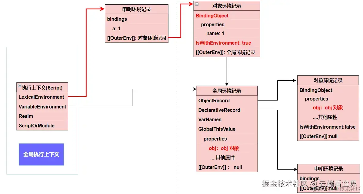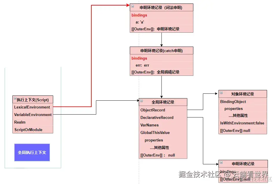 当然环境记录是不能单独存在的,其有相关的执行上下文,此外前面提到,通过 OuterEnv 形成链路,也就是作用域链,后面会细说。 所以 其全貌如下