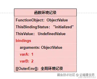 申明环境记录的子类。函数环境记录是一个声明性环境记录,用于表示函数的顶级作用域, 注意了是顶级,因为如果函数里面包含了函数,其会生成新的 函数环境记录。
