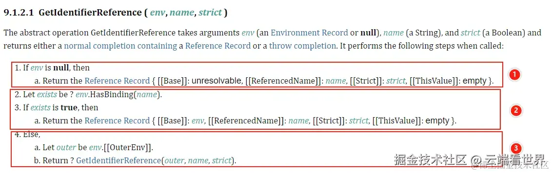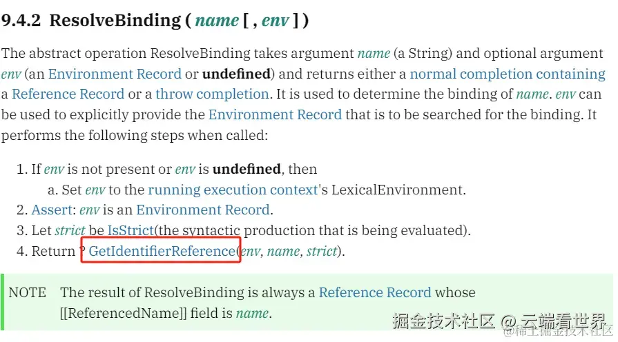 执行上下文(后续文章会细说)是通过 ResolveBinding ( name [ , env ] ) 找到对应的引用记录, 其底层是通过环境记录的 9.1.2.1 GetIdentifierReference ( env, name, strict ) 通过标志符获取引用记录。