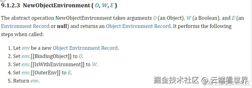 创建一个新的对象环境记录。 流程:新建一个环境记录,并对[[BindingObject]],[[IsWithEnvironment]],[[OuterEnv]]赋值。