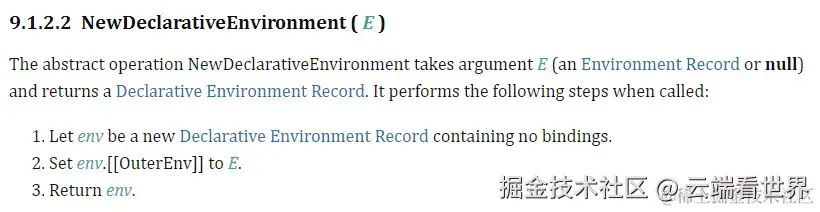 创建一个新的申明环境记录。参数 E 是一个环境记录, 会把新的环境记录的 [[outerEnv]]指向 E。