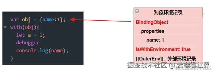 with语句会生成一个 对象环境记录,运行到 debugger,其对应的环境记录大致如下