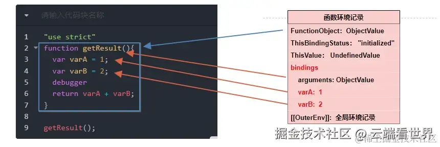 当函数被执行时会创建一个函数环境记录,代码运行到debugger时,环境记录的大致情况如下: