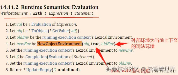 现在就很好理解 with语句了吧, 因为对象环境记录把标识符绑定与某些对象的属性关联起来,所以可以看起来可以直接使用对象属性。
