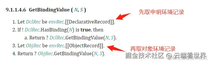 | GetBindingValue(N, S) | 环境记录返回已存在绑定的值。如果 S 为 true 且不存在绑定,则引发 ReferenceError 异常。如果绑定存在但未初始化,则抛 ReferenceError,与 S 的值无关。 |