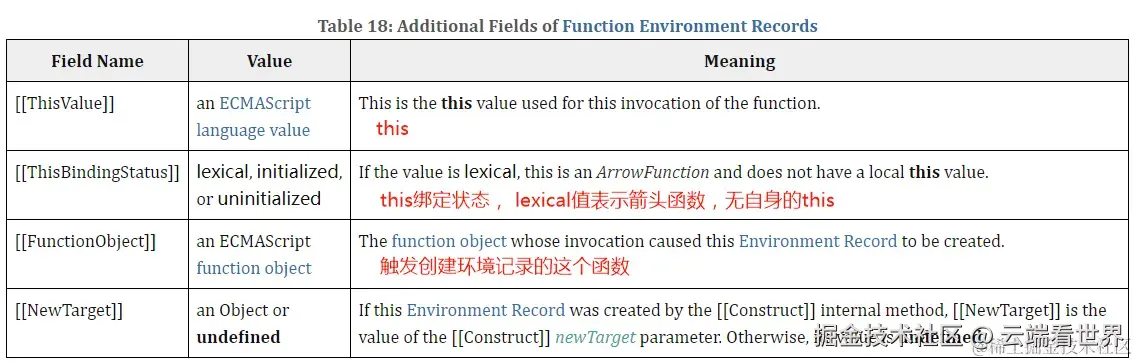 [[ThisValue]]: 可作为程序上的this[[ThisBindingStatus]]: this的绑定状态[[FunctionObject]]: 触发创建这个环境记录的函数对象,即日常编程中的function。