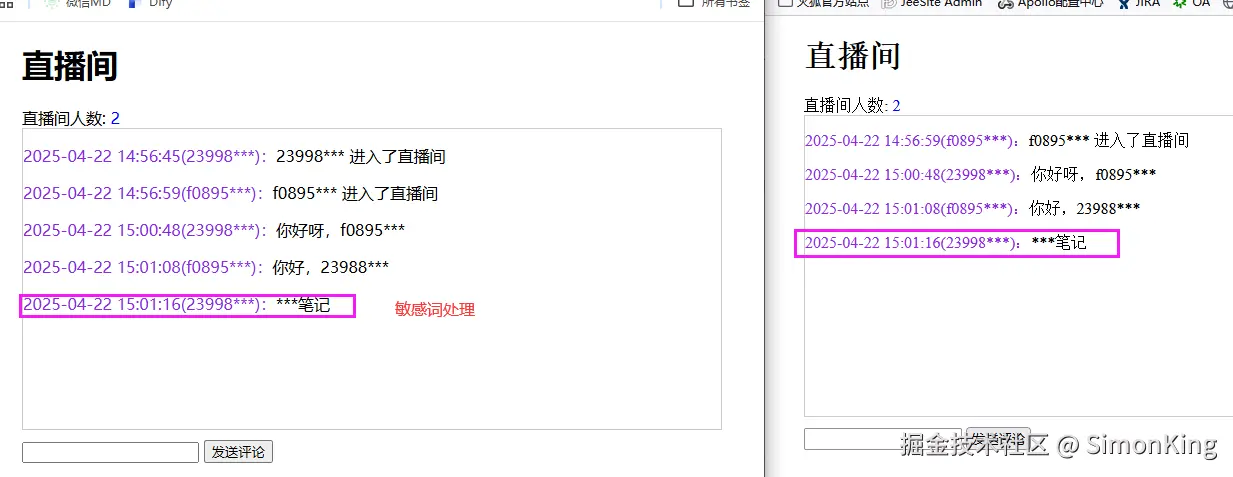 从Header中获取客户端的唯一标识,然后针对发送的信息进行敏感词过滤。然后通知所有的客户端,将信息展示在直播间。