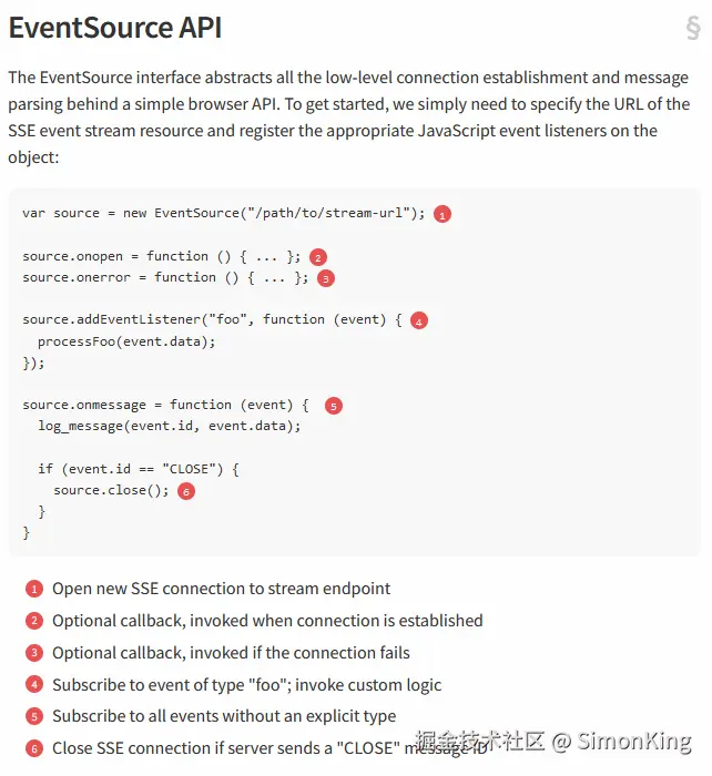 onopen、onmessage、onerror 是SSE客户端提供的监听方法,分别监听建立连接、服务端推送消息以及服务端异常时的回调方法。