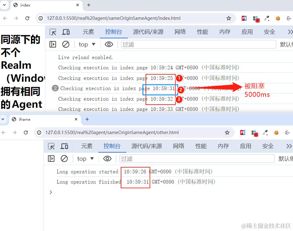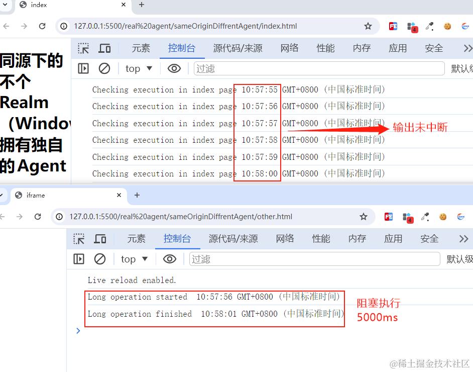 rel=noopener打开的other.html, other.html的阻塞不影响index.html的输出即可。 这里的 index.html和other.html就属于不同的Agent。// index.html <h1> 同源下的不个Realm(Window)拥有独自的Agent</h1> <a href="./other.html" target="_blank" rel="noopener">other页面</a> <script> function checkExecution() { console.log('Checking execution in index page', new Date().toTimeString()); } setInterval(checkExecution, 1000); // 每秒执行一次 </script> // other.html <script> // 页面1(或Web Worker1) function longRunningOperation() { console.log('Long operation started ', new Date().toTimeString()); const startTime = Date.now(); let i = 0; while (Date.now() - startTime < 5000) { // 假设执行5秒 i++; } console.log('Long operation finished ', new Date().toTimeString()); } setTimeout(() => { longRunningOperation(); }, 2000) </script>看输出结果