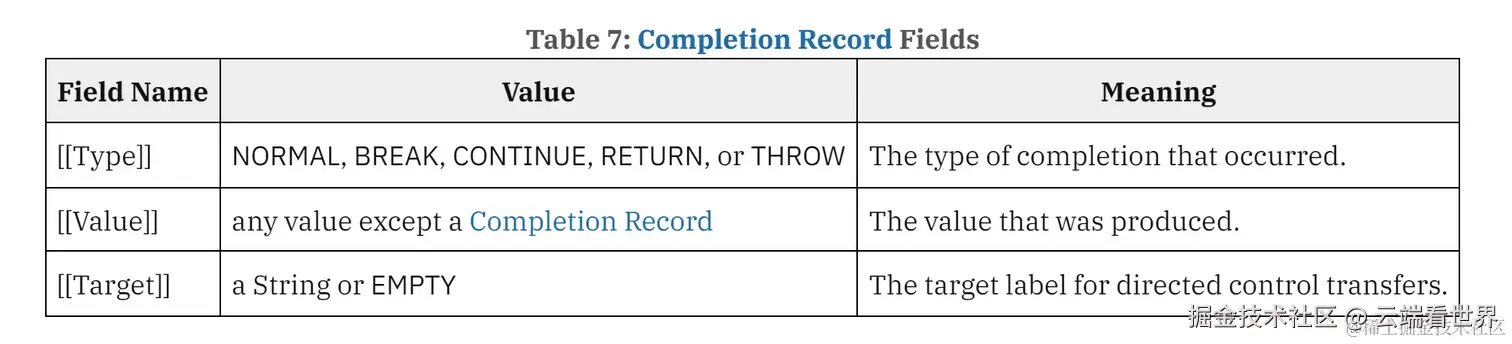 | [[Type]] | NORMAL、BREAK、CONTINUE、RETURN 或 THROW | 发生的完成类型 |