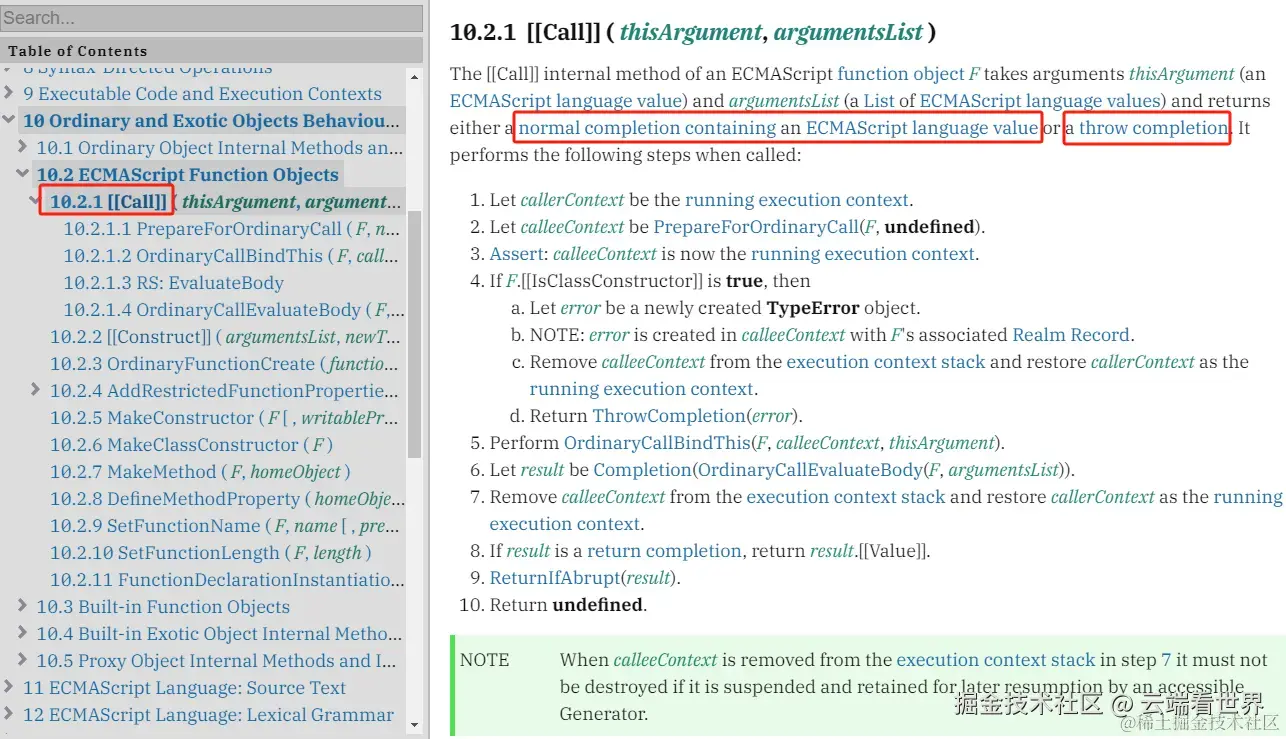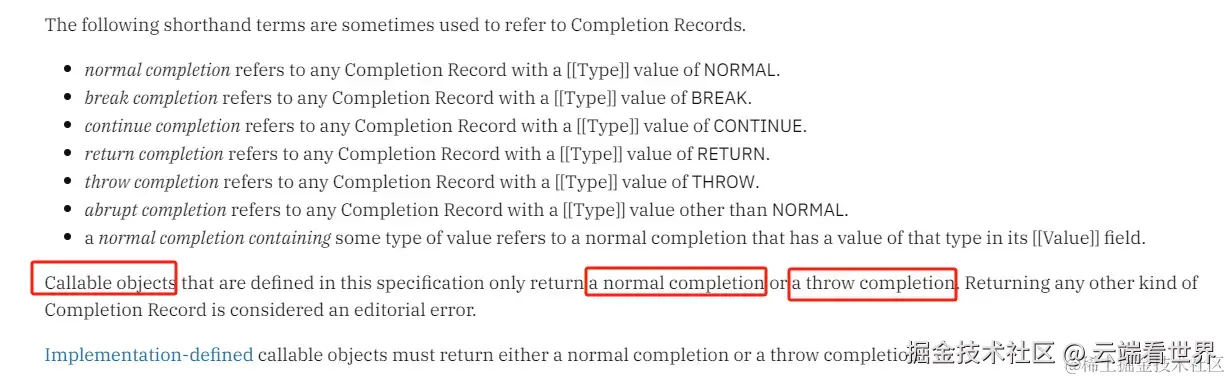 协议里有一段话,有红色标记的话,这里的 callable objects 指的就是函数对象,说 callable objects 在本协议中,只能返回 normal completion 或者 throw completion。