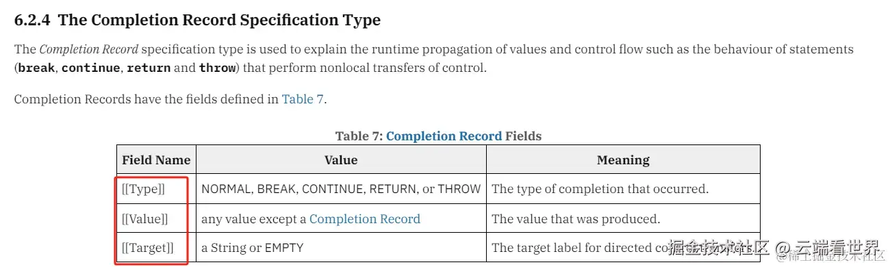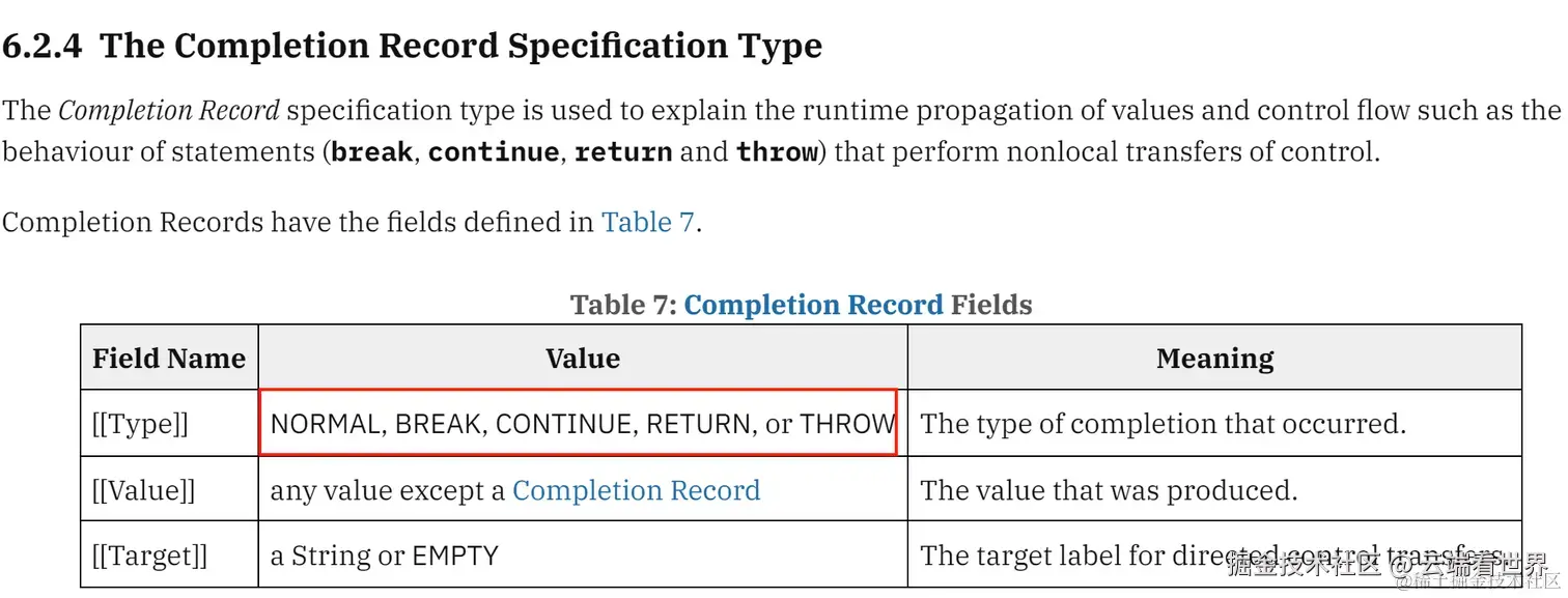 完成记录(Completion Record)被用来解释值在运行时的传播以及控制流的转移,例如那些执行非局部控制转移的语句(如break、continue、return和throw)的行为。