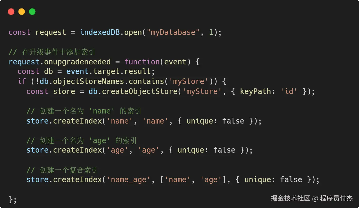 在 IndexDB 中,可在数据库onupgradeneeded事件中创建索引。