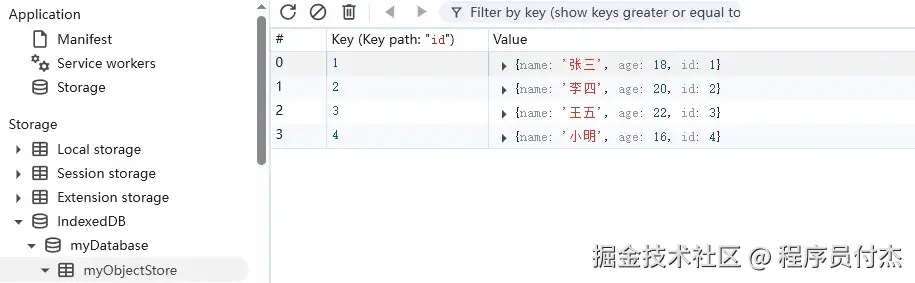 为了便于介绍索引与游标查询, 我们需要在开始前, 向IndexDB 数据库中添加如下测试数据。