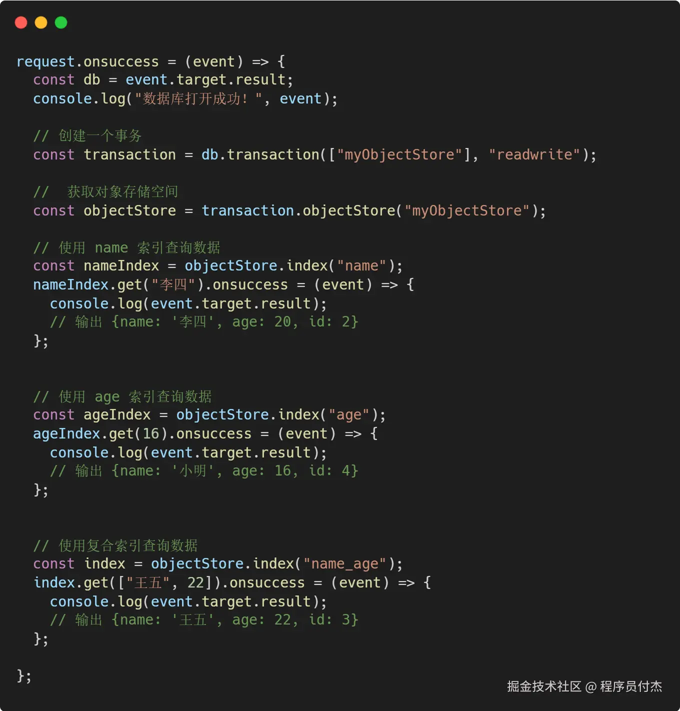 除了在对象存储空间上使用游标,IndexDB 还支持在索引对象上使用游标。在索引上使用游标时,数据将按照索引字段的顺序进行遍历,方便对特定字段进行排序和筛选: