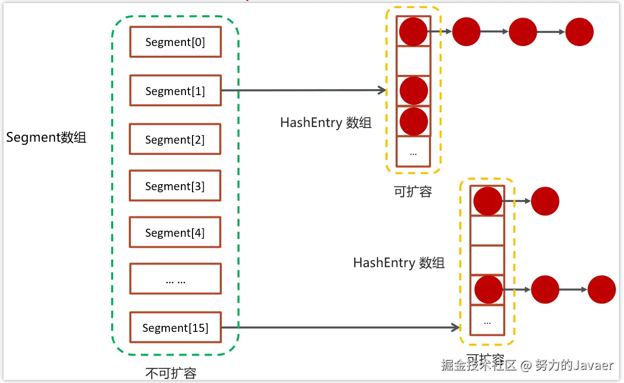 JDK1.7 的 ConcurrentHashMap 是由一个 Segment 数组组成的,Segment 类似于小 HashMap,每个 Segment 内部有一个 HashEntry[]。Segment 数组初始化后大小固定,而 HashEntry[] 可以扩容。每个 Segment 内部有一把 ReentrantLock,实现分段加锁。当多个线程同时修改同一个 Segment 的数据时,会竞争这把锁,从而保证线程安全。