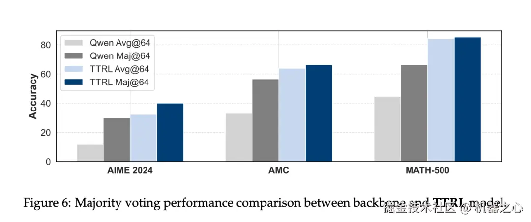 TTRL 受 Maj@N 监督,却超越了 Maj@N。图 6 展示了 TTRL 在 Qwen2.5-Math-7B 上的测试结果。可以看出,在所有基准测试中,TTRL Avg@64 均优于 Qwen2.5-Math-7B Maj@64,大大超出预期。此外,在应用多数表决时,TTRL 的性能也有大幅提升。