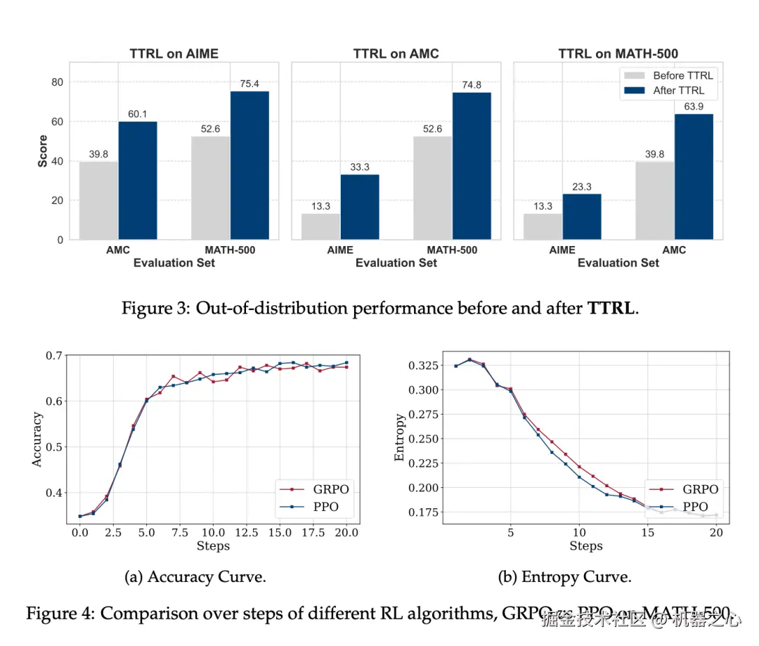 TTRL 与不同的 RL 算法兼容。图 4 展示了结果。研究者在 MATH-500 上使用 PPO 应用 TTRL,以评估其与不同强化学习算法的兼容性。PPO 和 GRPO 的性能轨迹非常接近。与 GRPO 相比,PPO 能产生更稳定的结果,同时实现相似的整体性能。