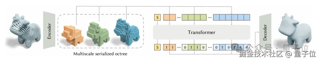 具体创新体现在以下三个方面:其一,通过八叉树结构对稀疏三维数据进行编码,有效提升了计算效率;其二,基于八叉树构建了具有层次性和局部性的多尺度 0/1 序列,确保序列化过程中空间特征的完整保留;其三,采用 Transformer 架构直接进行序列化预测,实现了对三维空间特性的端到端建模。