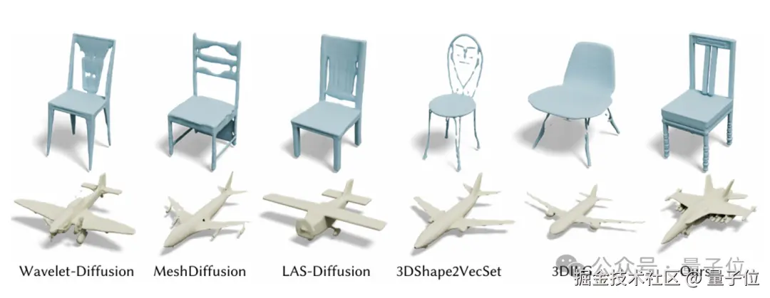 △在 ShapeNet 上与现有 SOTA 方法的定性对比